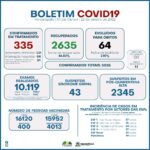 – Total de casos em tratamento: 335 pessoas, sendo 331 em isolamento domiciliar e 04 internados.