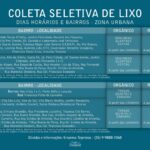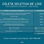 Início Notícias Coleta Seletiva de lixo – Dias, horários e bairros 17/03/2022 em Notícias Confira os dias e horários – Zonas urbana e rural. Dúvidas e informações: Empresa Tegminas – (35) 9 9888-7068.