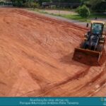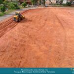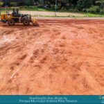 A área do campo de futebol já começa a ser preparada para o plantio de grama e a construção da pista de atletismo.
