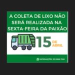 A empresa Tegminas, responsável pela coleta seletiva de lixo, informa que na próxima sexta-feira (15), feriado de Sexta-Feira da Paixão, não haverá coleta de lixo.