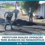 A Prefeitura de Paraisópolis realizou operação tapa-buracos em alguns bairros da cidade. Na quinta-feira (30), a Rua Diamantina, no Alto dos Fernandes, recebeu os trabalhos, assim como partes do Boa vista II e Goiabal.