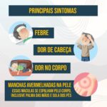 Febre, dor no corpo, dor de cabeça, pequenas manchas avermelhadas na pele (essas maculas se espalham pelo corpo, inclusive palma das mãos e sola dos pés).