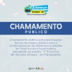 Chamamento público para autorização de uso de espaço público para a comercialização de alimentos e bebidas em food trucks e food trailers, atendendo ao evento “3º Encontro de Veículos Antigos”, em Paraisópolis.