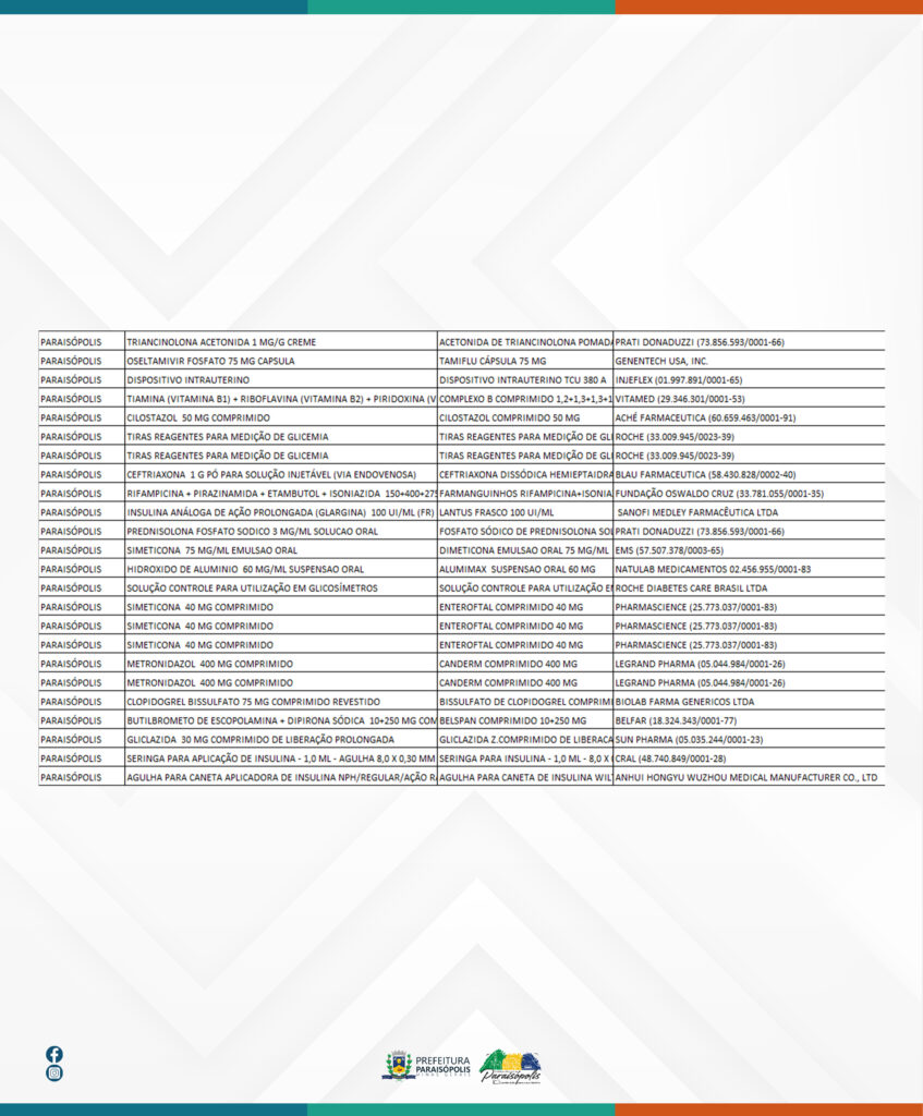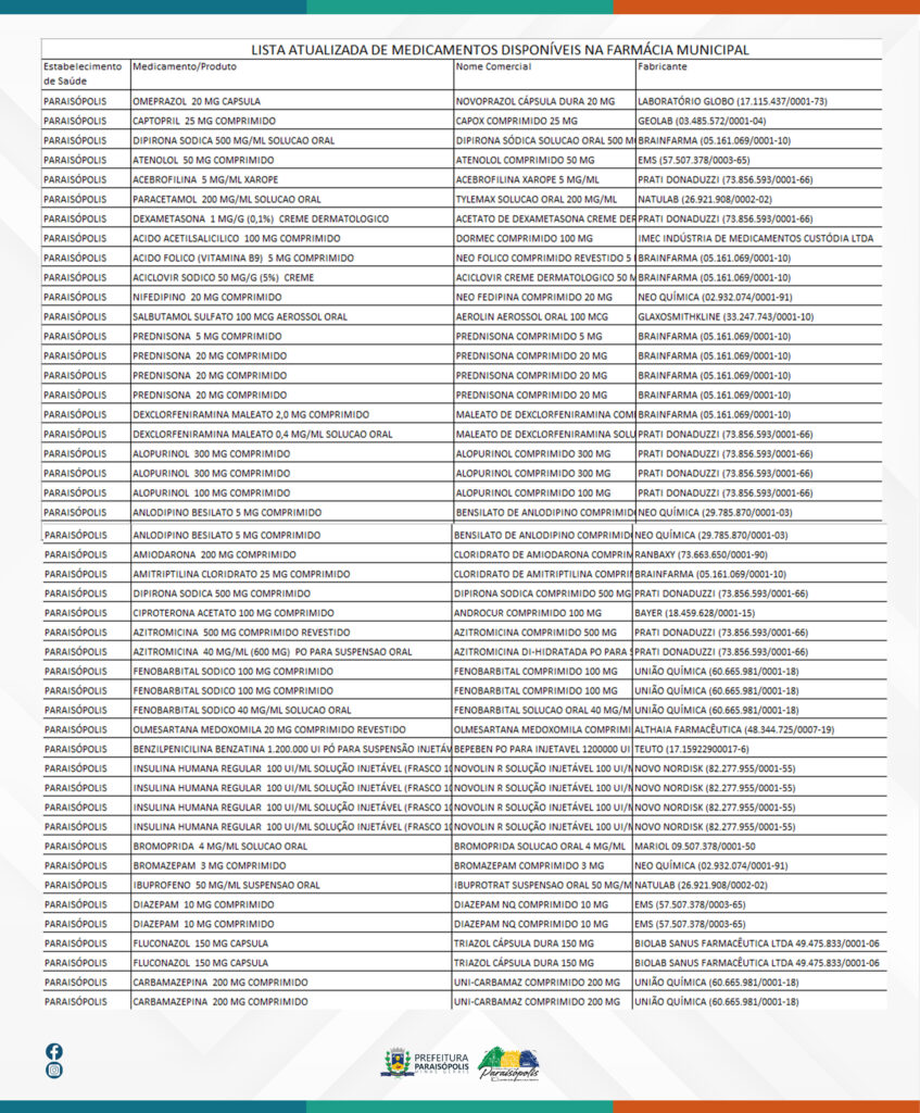 Outros medicamentos como, por exemplo, insulinas Humanas NPH, Insulina Regular, anti-hipertensivos e medicamentos oral para o tratamento do diabetes, também são disponibilizados pelo Programa da Farmácia Popular de Paraisópolis, mediante cadastro do usuário e a apresentação do receituário médico.