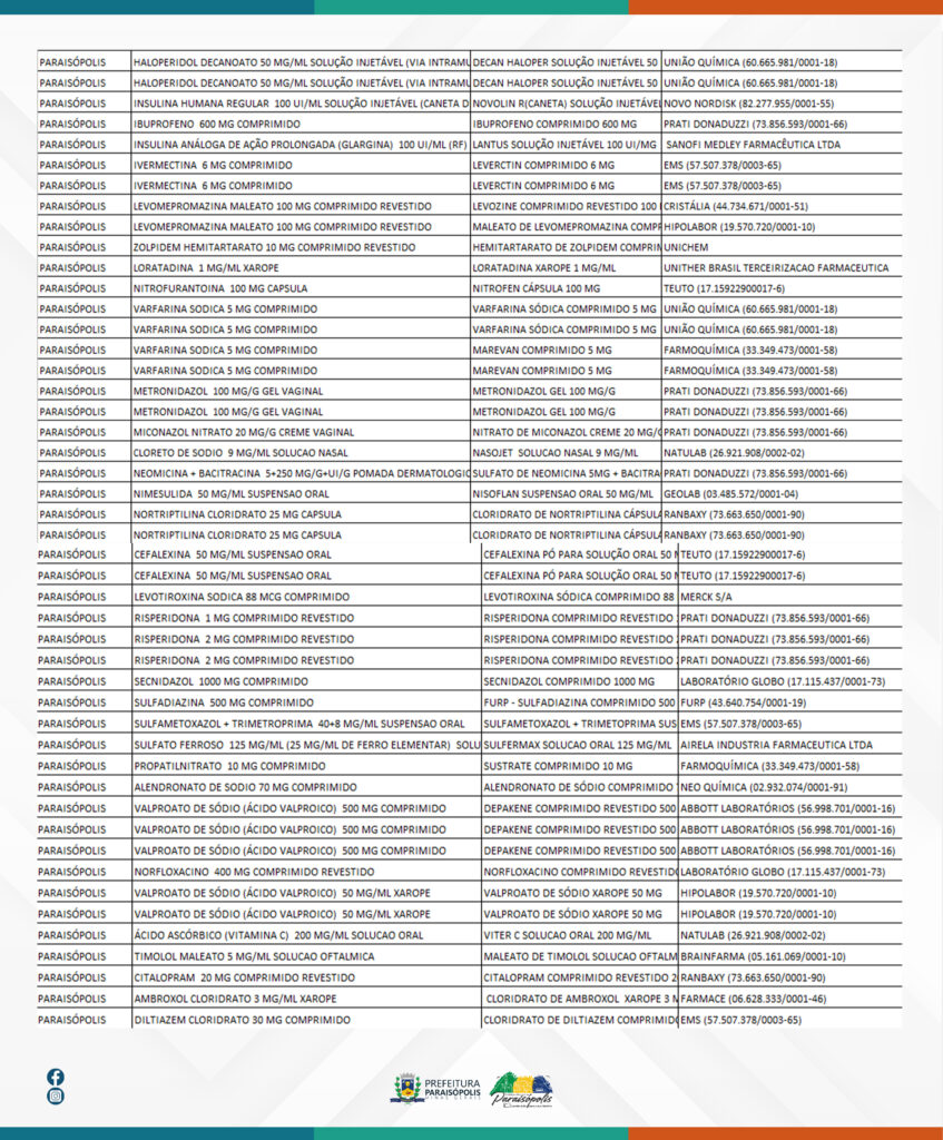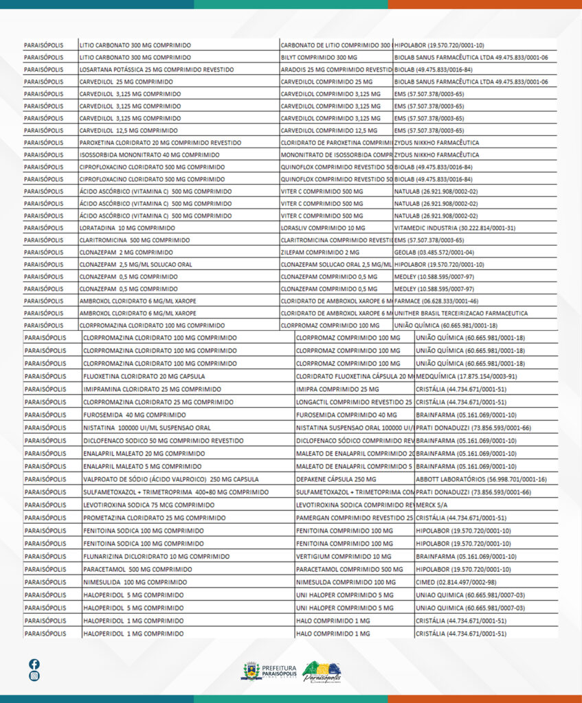 Foram emitidos e encaminhados pedidos de medicamentos que fazem parte do Componente Básico da Assistência farmacêutica do Município de Paraisópolis aos fornecedores vencedores, os quais aguardamos, no momento, o prazo para recebimento das mercadorias solicitadas. Reiteramos ainda que os medicamentos Dipirona e o ASS encontram-se disponíveis para o atendimento, normalmente, de toda a população conforme, descrito na listagem atualizada dos estoques de medicamentos da Farmácia Municipal, em anexo.