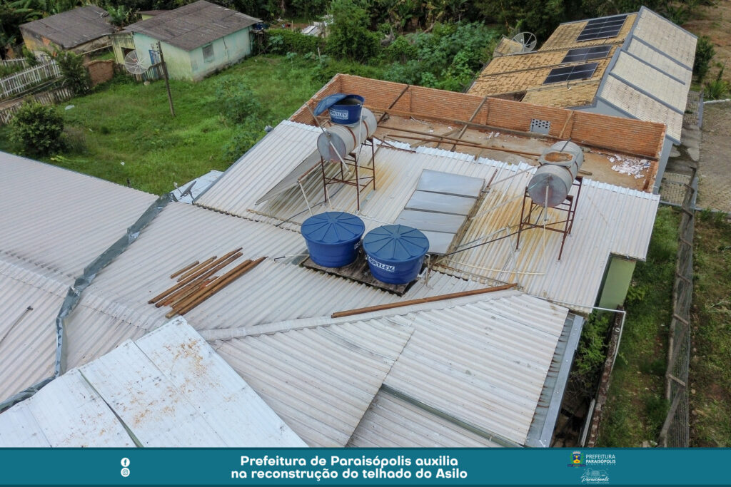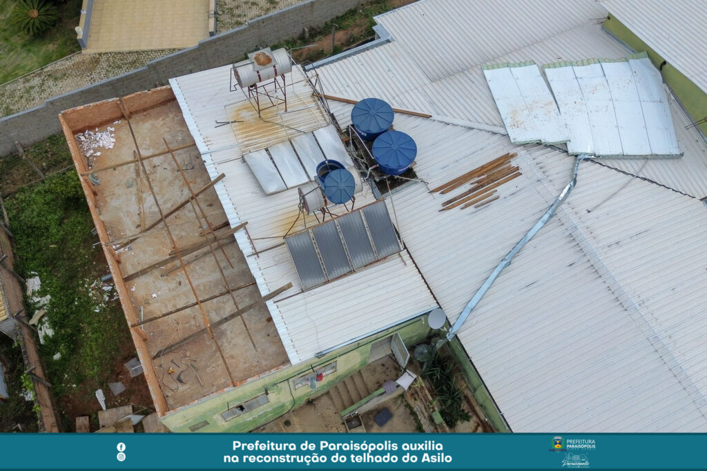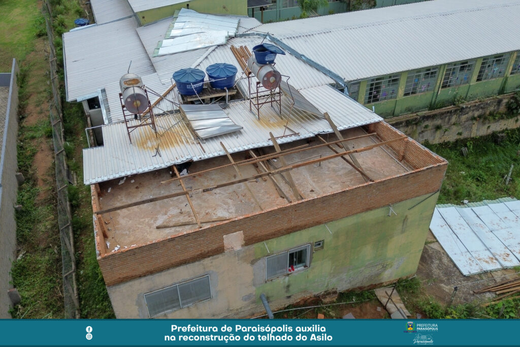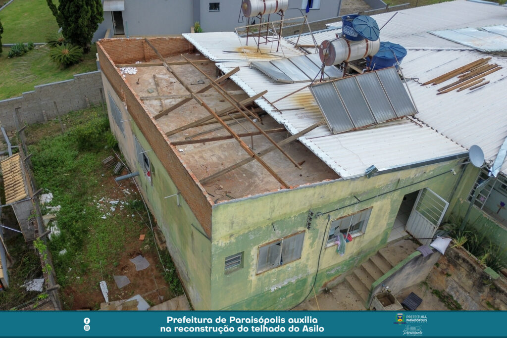 A Prefeitura de Paraisópolis auxilia na reconstrução do telhado, com mão de obra e materiais, da lavanderia e do banheiro masculino, no Asilo São Vicente de Paula. A estrutura foi danificada após a chuva e rajadas de vento do último final de semana.