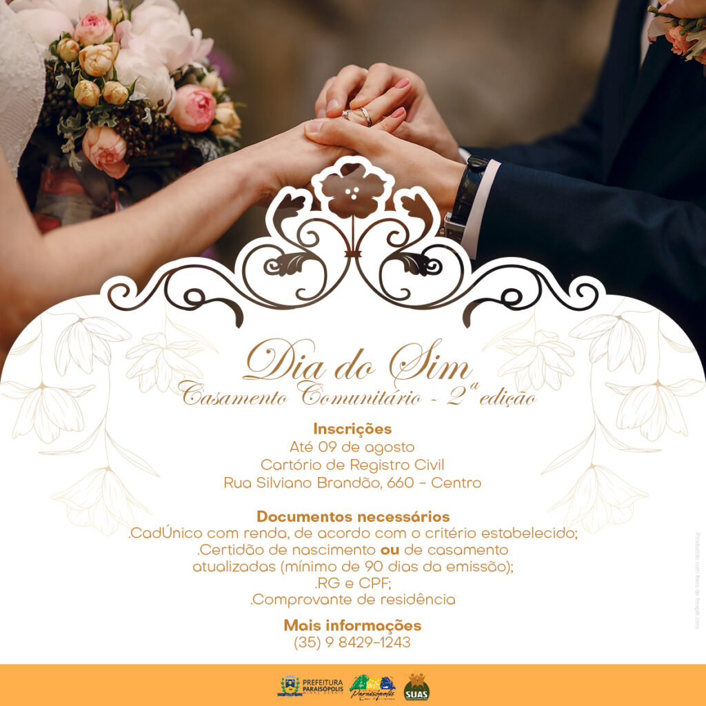 O CRAS, da Prefeitura de Paraisópolis, abre as inscrições para a 2ª edição do Dia do Sim – Casamento Comunitário.