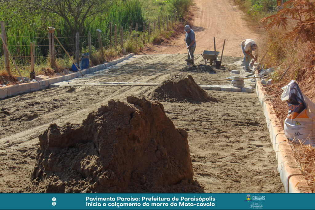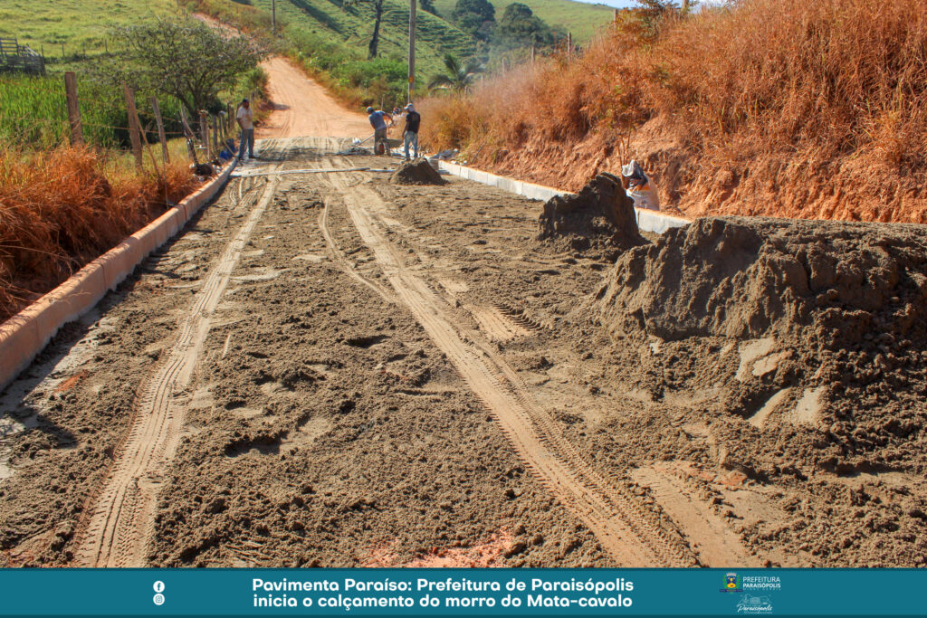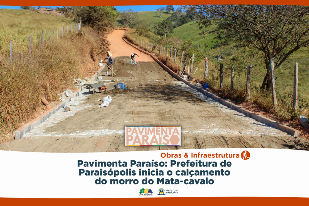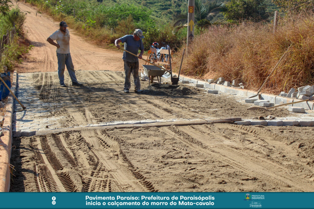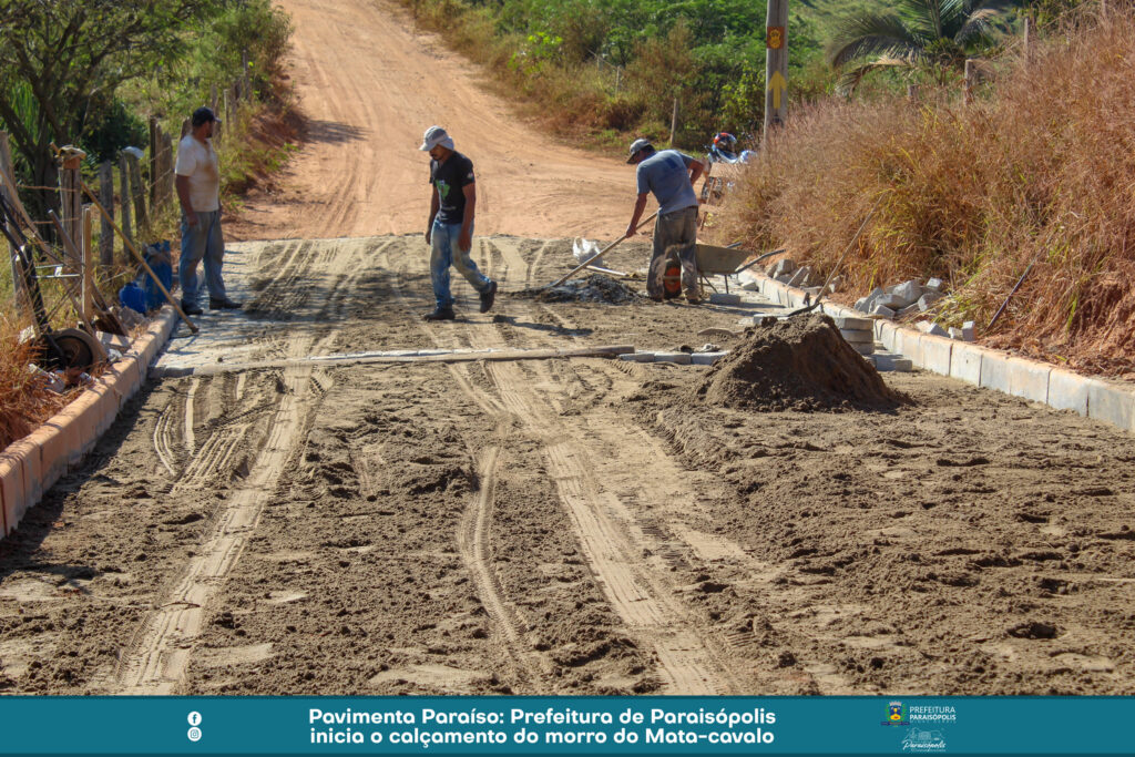 A Prefeitura de Paraisópolis iniciou mais uma obra dentro do programa Pavimenta Paraíso. Agora, o morro do Mata-cavalo – caminho para o bairro do Machadão – recebe pavimentação em bloquetes. No total, cerca de 500 metros da via, que tem grande inclinação, serão calçados.