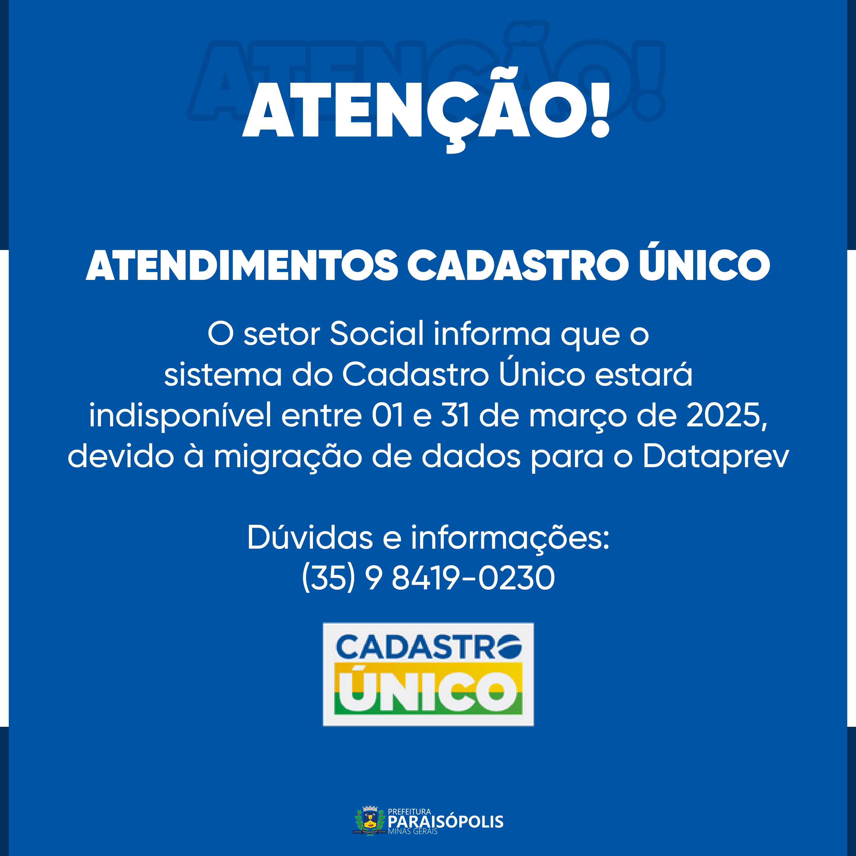 O setor Social informa que o sistema do Cadastro Único estará indisponível entre 01 e 31 de março de 2025, devido à migração de dados para o Dataprev.